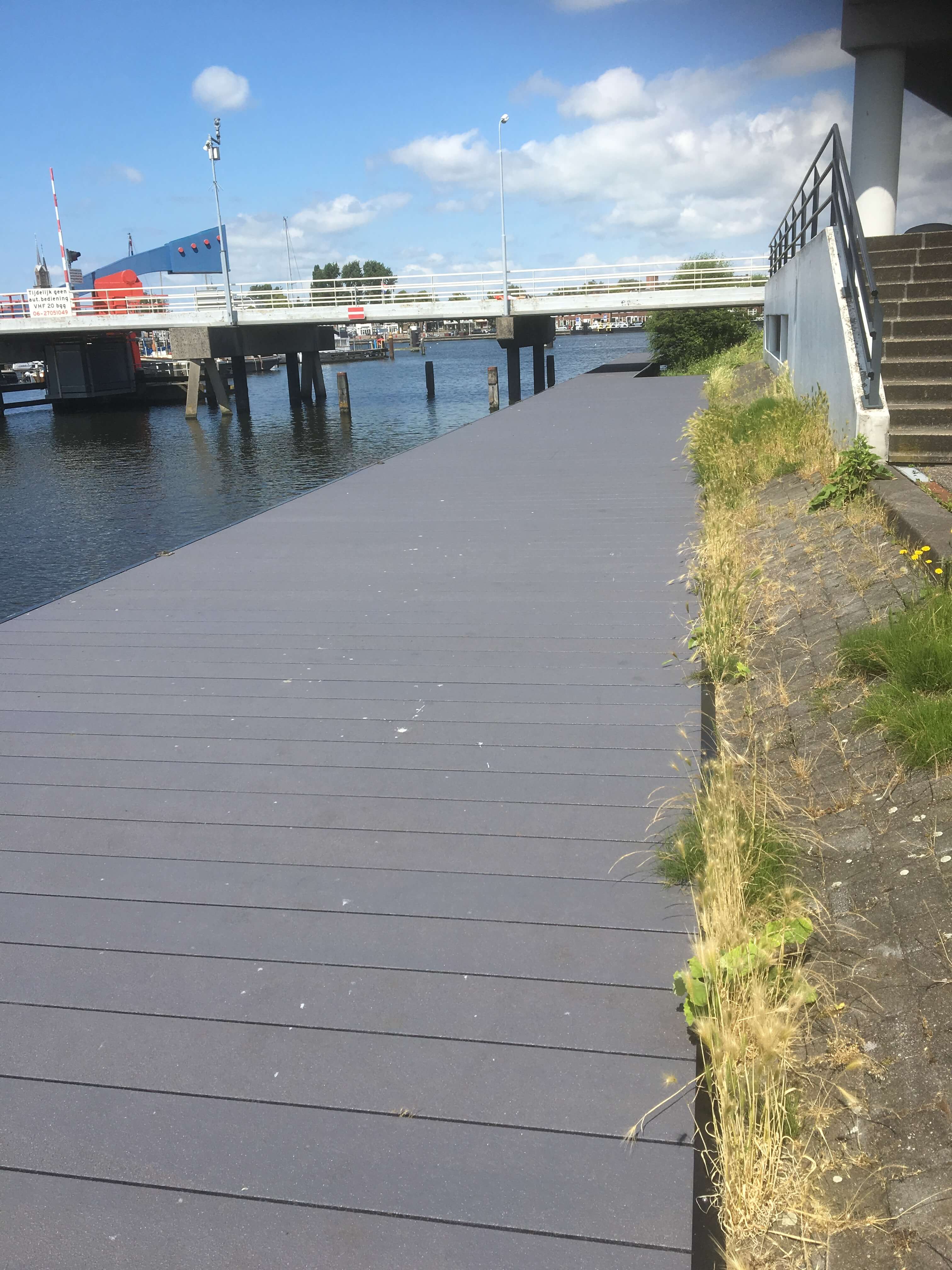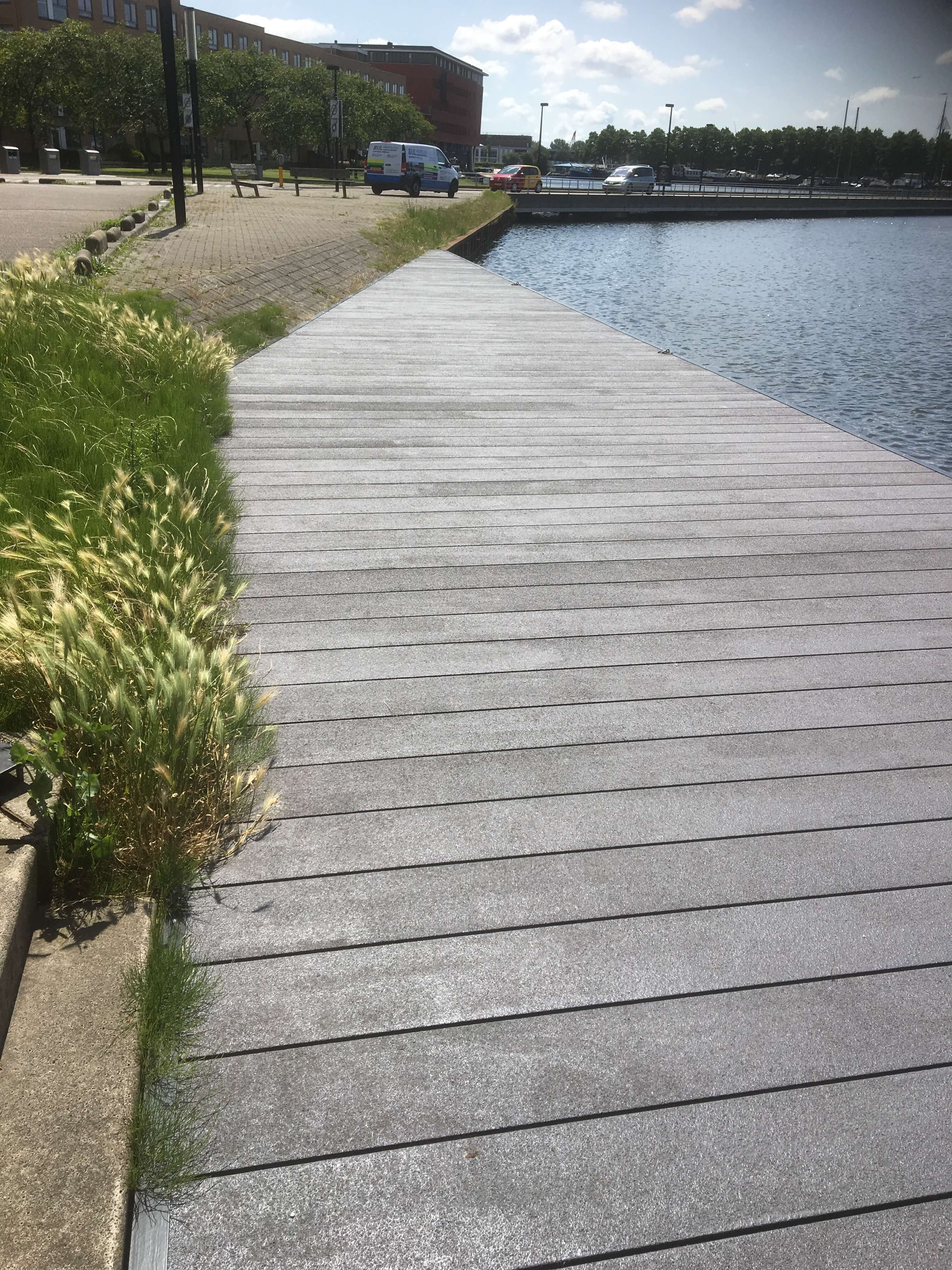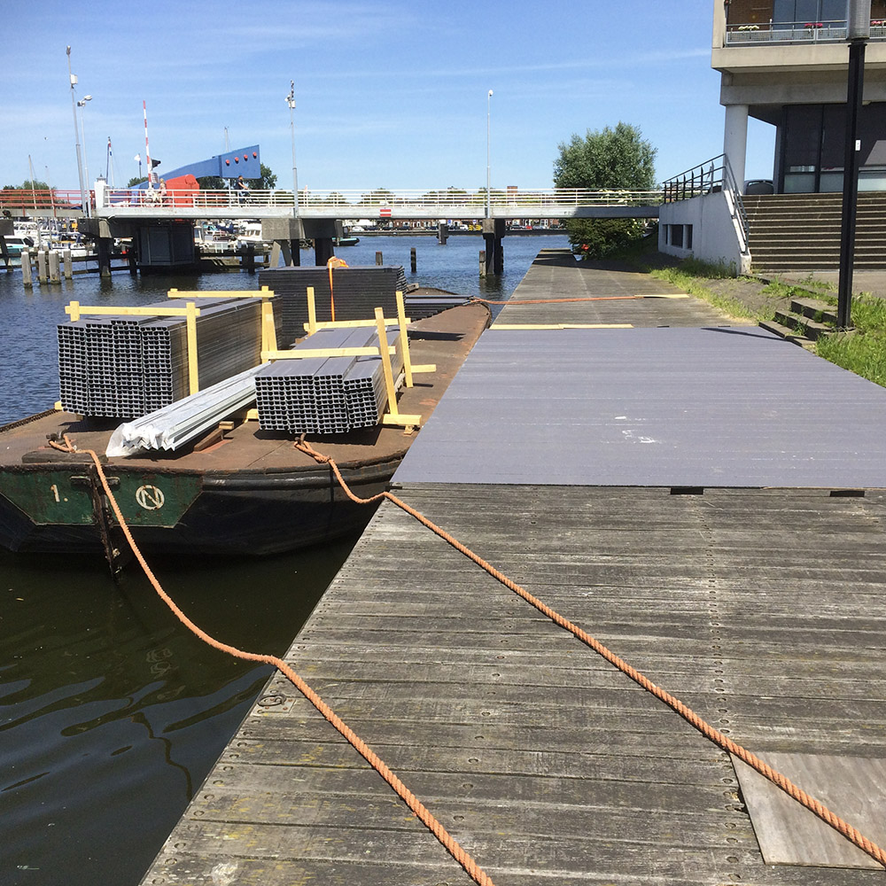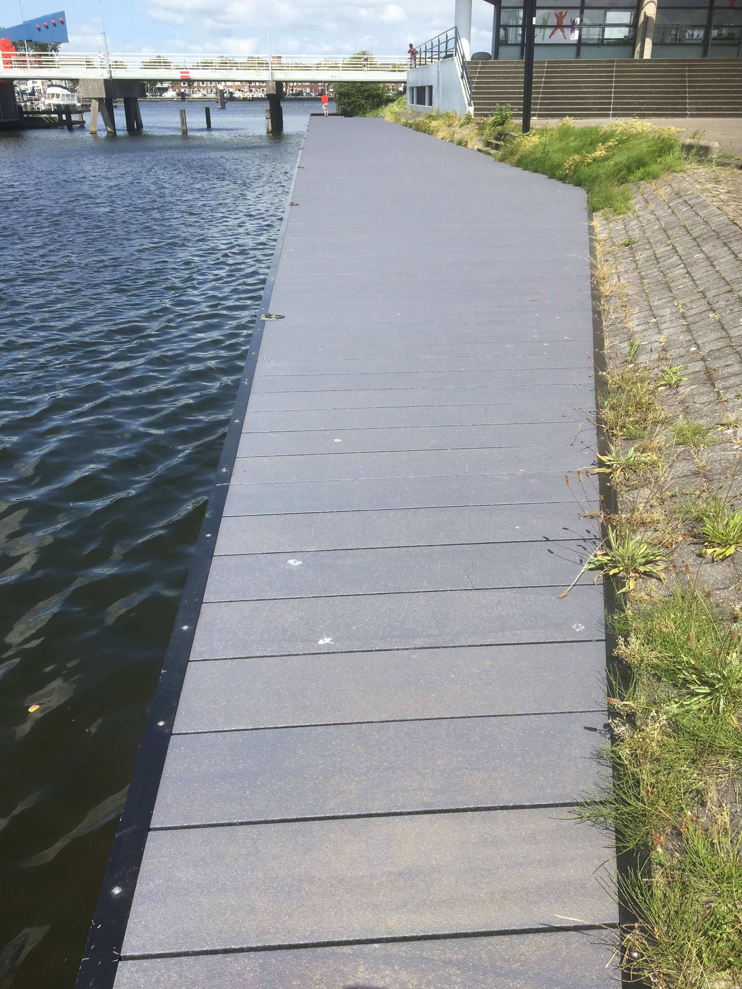 Der Steg im Spiekeroog am Alten Hafen an der Zaan war sanierungsbedürftig. Für den Ersatz des alten Holzsteges wählte die Gemeinde Zaanstad unseren GFK-Brückenbelag 256.40. Die städtische Instandhaltungsabteilung hat ca. 274 m2 selbst auf dem Unterbau des Steges angebracht. Die Instandhaltungsabteilung führte die Sanierung mit ihrem eigenen Wartungsschiff durch, womit die Unannehmlichkeiten für die Anwohner vor Ort auf ein Minimum reduziert werden konnten.