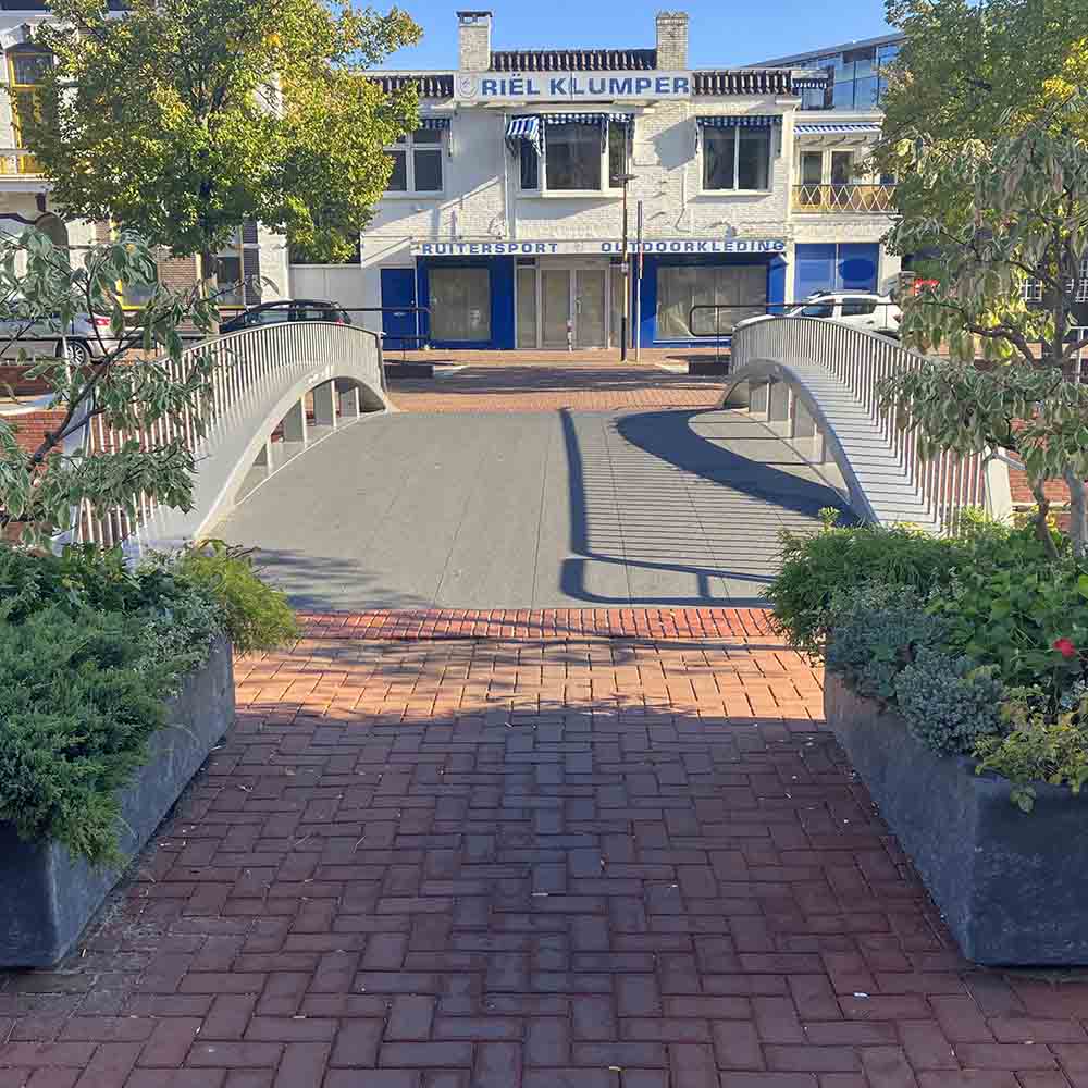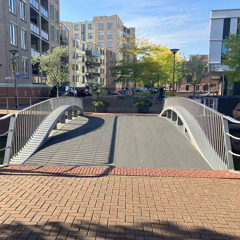 Voor de renovatie van het Stadhuisplein in Almelo leverden wij GVK Brugdekplanken die in de lengterichting op de brugconstructie van de nieuwbouw fiets- en voetgangersbrug werden geplaatst. De nieuwe brug heeft naast de bijzondere positionering van de GVK Brugdekplanken, mede door de speelse leuning, een fraai aanzicht. De voetgangersbrug, die tevens gebruikt wordt als fietsbrug, bestaat uit 48 m2 GVK Brugdekplanken type 500.40.