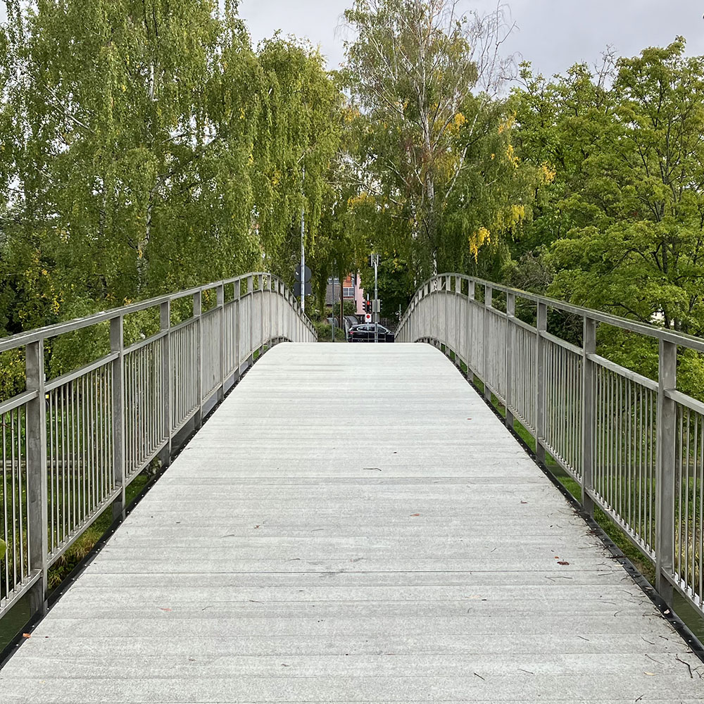 Since bridge structures and bridge decks are often composed of different materials, we have developed several innovative assembly methods. We offer an appropriate assembly method for every combination, depending on needs and requirements. For example, we have six unique methods for assembly on steel, as well as six unique mounting methods for assembly on wood. As a result, we can replace only the decaying section of bridge decking rather than the entire bridge, as demonstrated with the renovation of the cycle and pedestrian bridge in Germany.